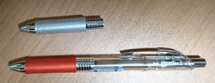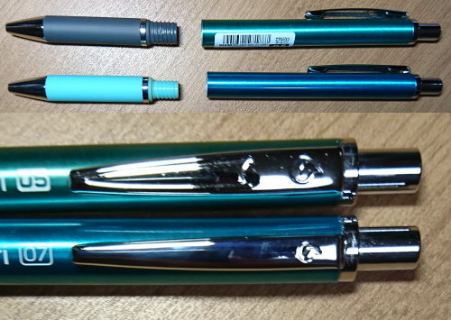 軸は、ノック式エナージェルに似ているが、全然別物。作りも異なるのだが、なにより製品精度が段違いで、このペンは個体によってノックがしづらかったり引っかかったりする。また、遠目で見るとそれほどでもないが、間近で見ると思ったより安くさい。