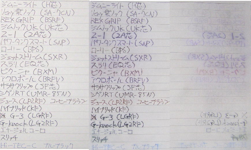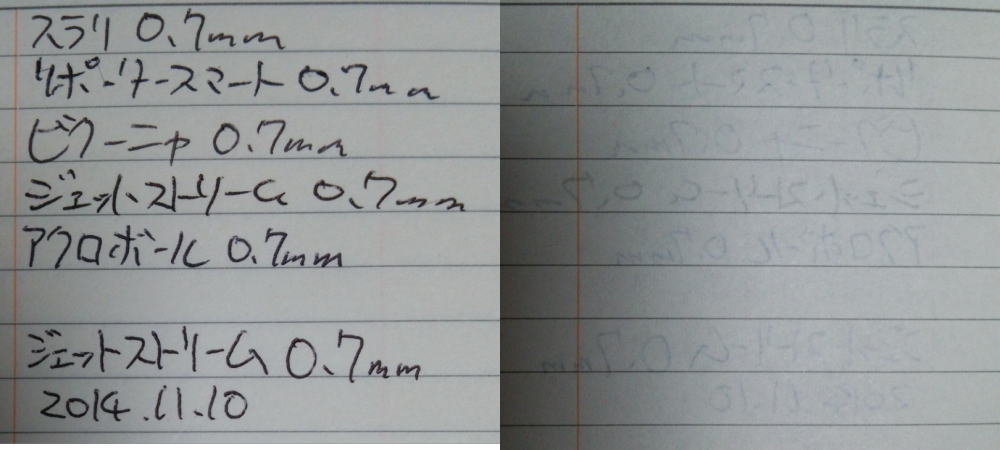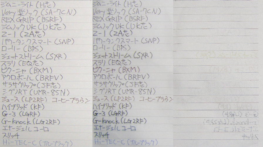リヒトラブのツイストリングノートのリフィル(この紙は、たいがいのボールペンで普通に筆記する分にはほとんど裏抜けしないが、コクヨのキャンパスやモレスキンの紙よりも若干裏抜けしやすい)に各ボールペンで筆記後、24時間放置し、その後水で紙をよく濡らしてこすった結果。左が実験前、中央が実験後表、右が実験後裏。
