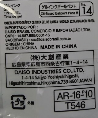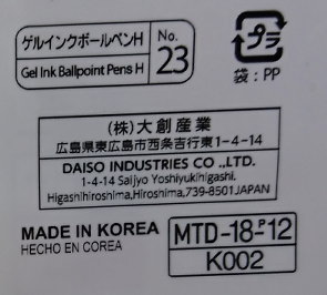 ダイソーで売られている正体不明のノック式ゲルインクボールペン。2本セットで100円+税で売られている。インクの色は知る限りでは黒のみで、ボール径は0.38mmと0.5mmがある。