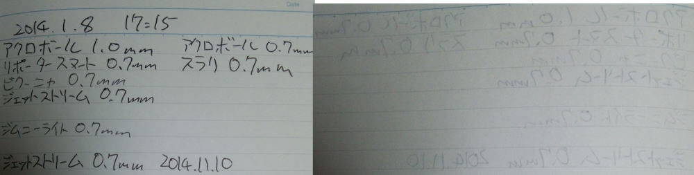 油性ボールペンは0.7mm黒、ゲルインクボールペンは0.5mm黒を用いているが、ジュースはコーヒーブラウン、エナージェルユーロは0.35mm、スリッチは0.4mm、Hi-TEC-Cは0.3mmのブルーブラックを用いている(手持ちにないため)。