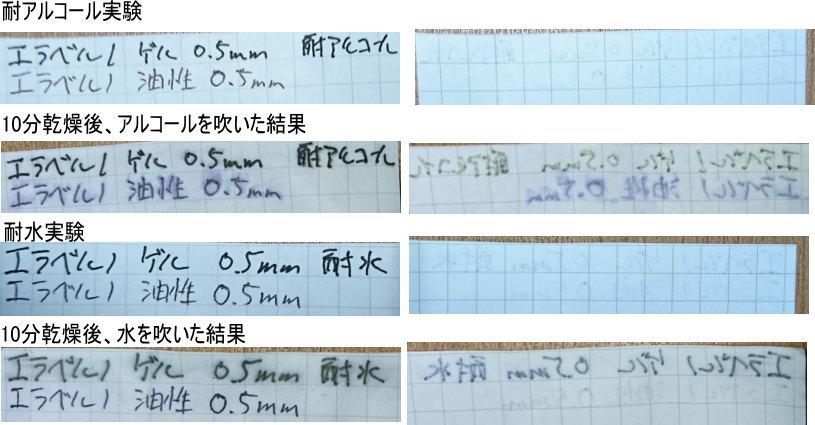 耐アルコール性は、油性はにじみと裏抜けが発生し、ゲルインクはにじみは少ないものの、裏抜けが発生する。