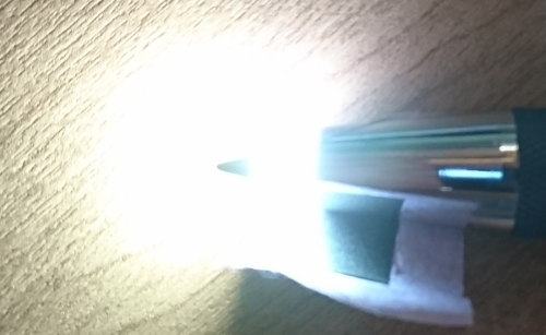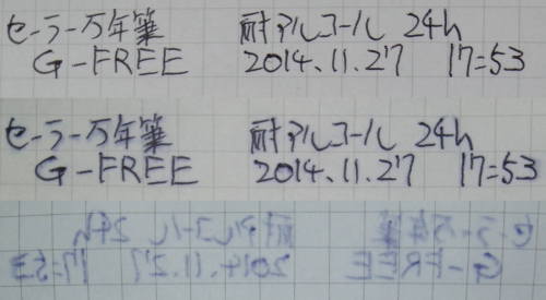 なお、例によって耐水、耐アルコール実験を行ったところ、書いてすぐに水やアルコールに漬けても脱色や滲み、抜けなどは生じなかった。この結果は実用面では朗報だが、インクの正体を特定することはできなかった。私の推測では油性顔料ゲルインクだと思う。