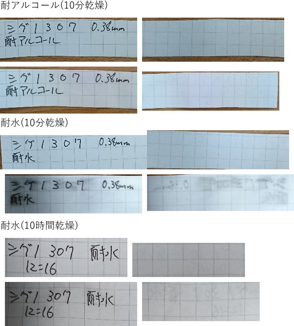 スリッチ、ハイテックCは、12時間の放置では字が定着せず、水をかけるとインクが流れてしまい、書いた字が消えてしまう。